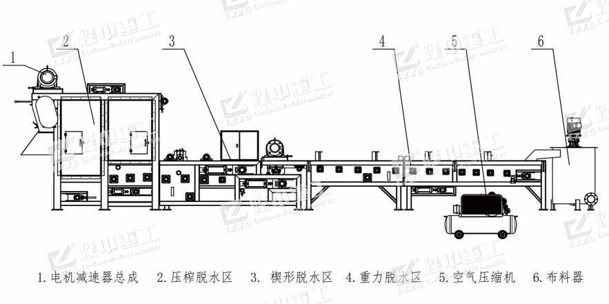 混合裝置、布料裝置、重力脫水裝置、楔形脫水裝置、擠壓輥高壓脫水裝置、自動(dòng)加藥系統(tǒng)、空壓機(jī)、氣電控制系統(tǒng)等。